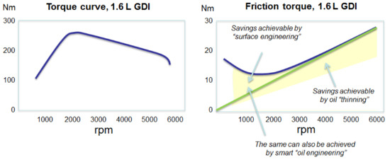 The torque curve (l.h.s.) and the friction torque (r.h.s.) for a production 1.6L i4 GDI engine. The primary engineering strategies for friction reduction are also shown [6].