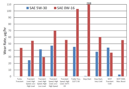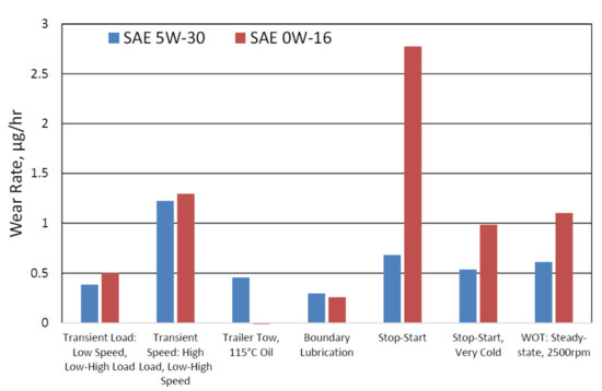 The primary obstacle to continually lowering lubricant viscosity is increased engine wear [15,16,17,18,19,20,21,22]. The hydrodynamic lubricant film thickness is directly proportional to lubricant viscosity. Therefore, to maintain hydrodynamic lubrication, substantial modifications in the engine hardware are often required including surface finish specifications, bearings, filtration systems, and oil pump, galleries and squirters. Without that the risk of excessive wear is real and cannot be ignored, see Figure 5.