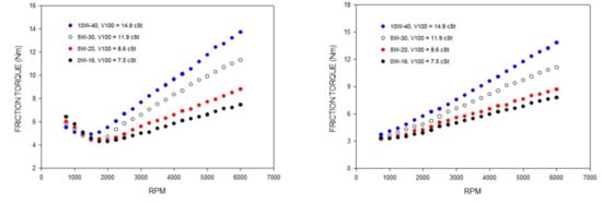 Motored engine rigs are very useful to study the effect of motor oil on engine friction [23]. Figure 8 and Figure 9 show friction torque data for two different gasoline engines. Used but functional production 2L i4 engines were used to build the rigs: Ford Duratec and Mercedes Benz M133. The main difference between the engines was the cylinder bore surface: honed cast iron vs. thermally sprayed, and the valvetrain type: direct-acting mechanical bucket (DAMB) vs. roller finger follower (RFF). The rigs were motored and run non-pressurized, using an external electric oil pump to supply engine lubricant.