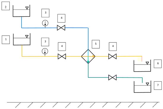 Diagram of the hydraulic system of the test stand. 1—upper oil tank; 2—upper coolant tank; 3—thermometer; 4—shut–off valve; 5–oil–cooler; 6—lower oil tank; 7—lower coolant tank.