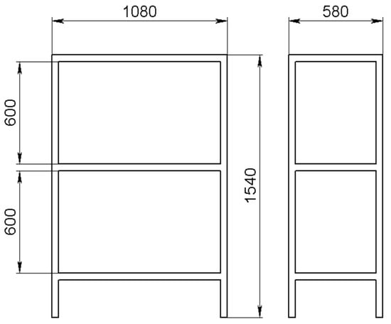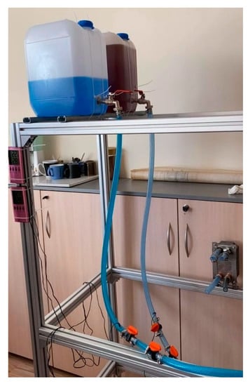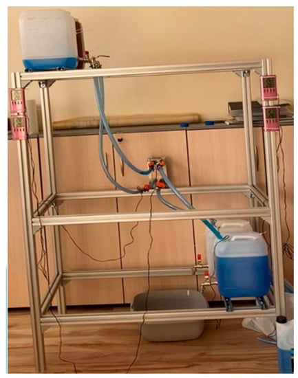 The supporting structure of the test stand was based on a frame made of standard BOSCH 40 × 40 four-groove system profiles connected with each other by means of angle bracket, screws, and nuts. Three horizontal subframes (three levels) were made. Two tanks, called upper tanks, were attached to the upper level, one was filled with oil, the other with coolant. The upper tanks were attached to Fischer FLS 17/1 16 × 20 × 46 C–shaped mounting rails screwed to the frame and sealed with a special adhesive for sealing hydraulic systems. At the outlet of each upper tank there was a shut-off valve connected to a pipe made of plastic.