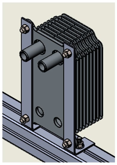 On the middle level, the tested oil–cooler was attached to the profile with a dedicated adapter. The cooler was attached with DIN EN ISO 7046–1 M6 × 16 screws to the 6 mm thick plates, which were bent at an angle of 90° and fixed to the profile with screws (Figure 5). The cooler has been installed in the same position as it was originally on the engine to maintain proper flow through the oil-cooler. Shut off valves were placed on the inlet and the outlet of the oil-cooler to allow for the entire system to be filled with liquids. The shut-off valves located on the inlet of the oil-cooler are connected to the appropriate shut-off valves at the outlets of the upper tanks. On the other hand, the shut-off valves located on the outlet of the oil-cooler are connected to the appropriate shut-off valves located at the inlets of the lower tanks.