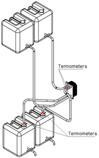 Four identical digital thermometers were used to monitor the temperature of the liquids. Temperature was measured on the inlet of the oil–cooler and on the inlet of the lower tank (Figure 7). Such setup of thermometers was performed in both two flow lines of the tested liquids.