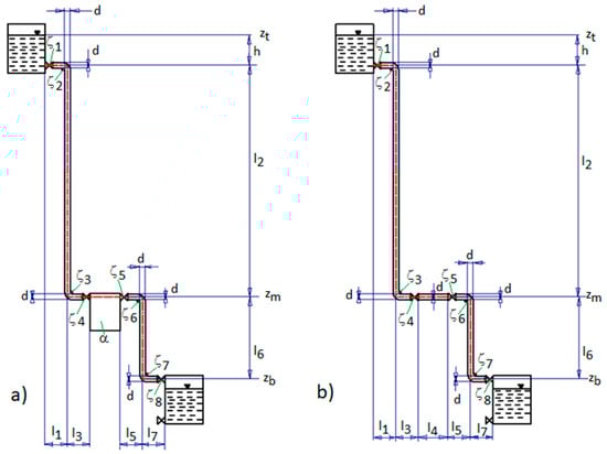 The distance between the levels was 600 mm (Figure 6), which allowed the fluid to flow freely, and the conduit used was routed as straight as possible to limit the flow resistance.