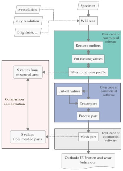 Virtual simulations are a relevant element in product engineering processes and facilitate engineers to test different concepts during early phases of the development. However, in tribological product engineering, simulations are hardly used because input data such as material behavior are often missing. Besides the material behavior, the surface roughness of the contacting elements is relevant for tribological systems. To expand the capabilities of the virtual engineering of tribological components such as bearings or brakes, the hereby presented approach allows for the depiction of real rough surfaces in finite element simulations. Rough surfaces are scanned by a white-light interferometer (WLI) and further processed by removing the outliers and replacing non-measured samples. Next, a spline generation creates a solid body, which is imported to CAD software and afterwards meshed with triangle and quadrilateral elements in different sizes. The results comprise the evaluation of six differently manufactured (turned, coated, and pressed) real surfaces. The surfaces are compared by the deviations of the roughness values after measuring with the WLI and after meshing them. Furthermore, the elements’ aspect ratios and skewness describe the mesh quality. The results show that the transfer is dependent upon deep cliffs and large Sz values in comparison to the lateral expansion.