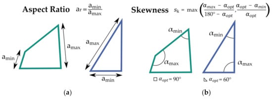 (a) The computation of the aspect ratio for 2D elements. (b) The computation and determination of the skewness.