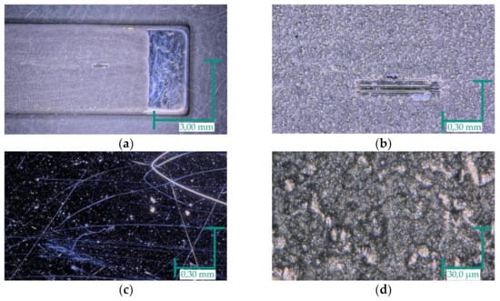 (a) Iron plate with a microtribometer path. (b) Detailled view of the microtribometer path. (c) Polished iron surface. (d) Graphite surface. (See [] for the results of the investigation of the friction behavior).