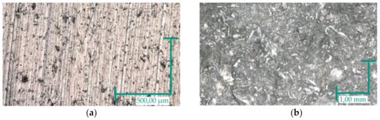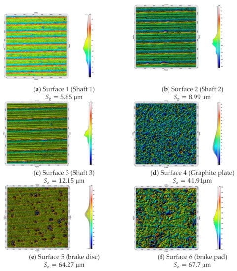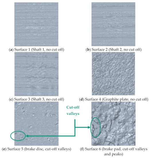 The method is presented by using six specimens with different technical rough surfaces, which were manufactured by different processes and from different materials. The first three surfaces were three sections of one shaft. The sections were turned with different feed rates to get different S values. These specimens are examples for turned surfaces which are commonly used in journal or ball bearings. The shaft’s material was SJ235 steel. Surface four from a graphite-coated plate was used for micro tribological sliding tests (Figure 3). This specimen origins from an investigation of the graphite friction behavior [] and shows the structure of a coated surface. The brake disc was made from cast iron. The final manufacturing step was a surface turning. The brake pad was made of an unknow material composition and bonded to a metal back plate. Both parts were from an SUV brake system (Figure 4). In this investigation, these two parts represent surfaces of a real technical system.