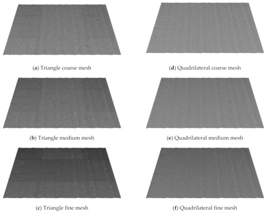 The meshes of Surface 1 are displayed in Figure 7. The depiction of the manufacturing marks in the mesh increased with a decrease in the element sizes. In the quadrilateral meshes (Figure 7a–c), support lines are visible. These lines were created by the spline generation. The mesh algorithm took the lines as support values for the node and element creation. Since the lines follow the surface topography, these lines did not interfere with the height coordinates itself and therefore did not influence the results. The element orientations at the support lines hamper a clear visibility of the rough surface. However as expected, with decreasing element size the ability to depict the real surface increases, as can be seen in the columns in Figure 7. This means that the finer mesh created a better representation of the real surface. Surface 2 and Surface 3 were similar to the one shown in Figure 7. The elements clearly depict the surface topography which had been exported from CAD software. With triangle meshes, the spline support lines were used for node creation by the mesh algorithm. For this reason, they are clearly visible in the triangle meshes.