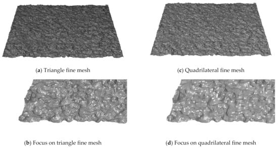 Figure 8 displays the meshed surface 4 (graphite plate). The mesh algorithm finely coped with the asperities and valleys in both mesh types. A zoom-in in Figure 8d showed that the quadrilateral mesh consists of circular structures. These circular structures consist of a few triangle elements, which increase the depiction precision of the mesh. The quadrilateral mesh coped fine with the asperities and valleys, although the real surface contained medium-high surface gradients. Noticeably, much more elements were required for the triangle fine mesh. The quadrilateral mesh requires about 40,000 elements and the triangle mesh about 80,000 elements.