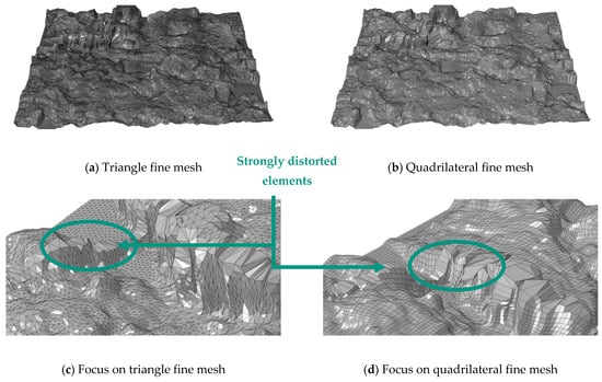 The meshed surfaces have a good graphical (qualitative) agreement with their real surfaces, since the hills and valleys are clearly depicted by the elements. The graphical differences between the triangle and quadrilateral meshes occur due to the different form of the elements. The quantitative comparison follows in Section 3.2. In contrast to Surfaces 1–5, Surface 6 contained high gradients even with a valley cut-off value. Figure 9 displays the triangle and quadrilateral fine meshes of the brake pad surface. Both meshes contained strongly distorted elements in the top left area of the surface. The zoom-in view in Figure 9b,d reveals many badly shaped elements, which were clearly not suitable for any FE simulations. Further attempts with different mesh algorithms in different software failed too. At steep slopes, the algorithms created nodes at the bottom, on the steep slopes themselves, and on the top. This resulted on the one side in highly deformed elements. On the other side, these elements had acute angles to neighboring elements. Attempts to mesh the surfaces in three dimensions resulted in areas with elements of negative volume.