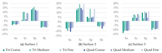 The deviations of the Sa values of Surfaces 1–3 was continuously increasing from the maximum value −3.5% to a minimum value of −13.6%. So, the meshed surface 3 coped worse with its real surface than Surface 1 with its corresponding real surface. If the focus lies on the individual mesh, all meshed surfaces of Surface 1 coped fine with the real surface according to the Sa value, since the difference of minimum and maximum is just 1.1%. The Sz and Sp values have larger deviations, but the coarse triangle and quadrilateral meshes were positive outliers, as Figure 10a displays. The Sk values followed the negative tendency of the Sa values. The Sp deviation increased with finer meshes. No relation between the mesh type or the mesh size with the deviation was found in the results of Surface 1. Although, the Sa and Sk results of Surface 2 show (cf. Figure 10b) that with decreasing mesh size the deviation decreased, too. By contrast, the Sz and Sp values strongly differed, even with increasing the mesh size. The last surface of the set showed the largest deviations in terms of Sa and Sk values. Most of the Sz and Sp deviations were below 10%. All turned surfaces had in common that the Sa and Sk values decreased, whereas the Sz and Sp values increased, with a finer mesh size. No clear relation between the mesh type or size was noticeable.