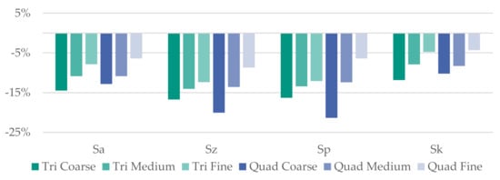 Figure 11 depicts the results for the graphite-coated plate. The Sa deviations are in a similar range as the values for the shafts’ surfaces. The Sa and Sk values are between −4% and −12%. However, the deviations for Sz and Sp are negative, too. The Sp values show that with decreasing the mesh size a better representation of the real surface can be achieved. So, an effect of the mesh size is visible since the deviations reduce with decreasing mesh size for each S value.
