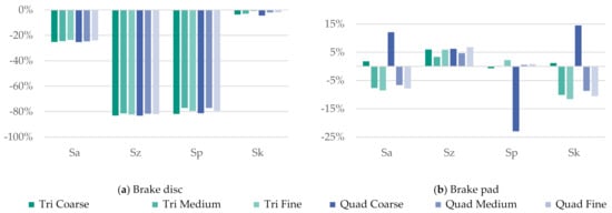 The cut off with Surface 6 (the brake pad) is even clearly visible in Figure 6f. The surface had a graphically bad mesh, which obviously cannot be used for FE simulations. As a result of the adaptions, the deviations themselves lie between −23% and +14% (cf. Figure 12b). Some meshes were able to depict the S values of the real surface, but as the graphical evaluation showed earlier, the graphical quality was in general bad. So, the variation between the meshes is large and the values do not follow any pattern (cf. Figure 12a). The bad graphical mesh and the inconsistency of the S values show that this surface has been difficult to mesh and the present surface cannot be used for an FE simulation.