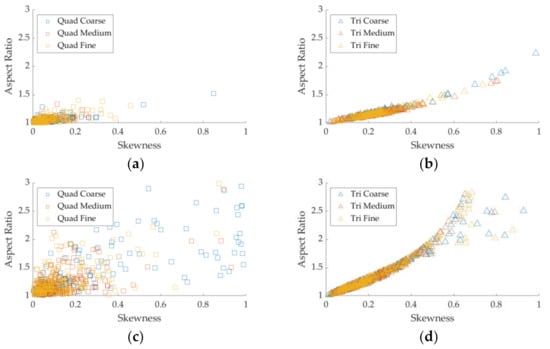 Besides the conformity of the mesh, another criterion was the mesh quality. To evaluate the mesh quality, each mesh was assessed by its aspect ratio, and skewness. The aspect ratio describes the relation between the minimum and maximum edge length in an element. If the aspect ratio is 1, all edges have the same length. However, the aspect ratio alone is insufficient to describe the form of an element. Thus, the skewness is necessary. It relates the minimum and maximum angle in an element to the optimal angle for the given form. The quality measures are graphically displayed in Figure 2.