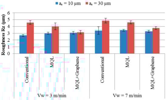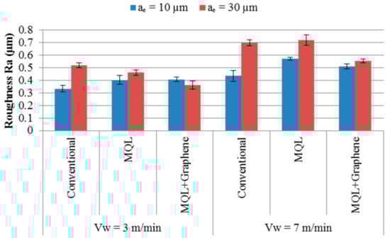 z, while with respect to the cooling–lubrication conditions, the addition of the graphene platelets to the cutting fluid contributed to obtaining the lowest values for both roughness parameters. The increase in a
