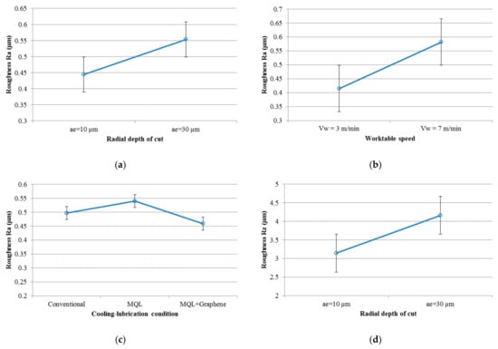 Table 9. It was observed that with a 95% confidence interval, the radial depth of cut, workspeed, and the cooling–lubrication conditions, in addition to the interactions of a
