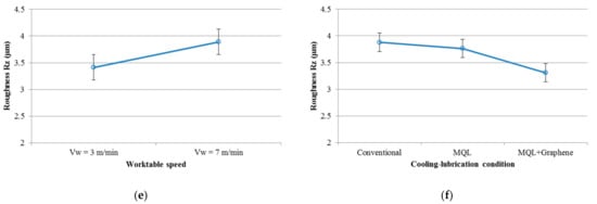 Table 5, the MQL + Graphene cooling–lubrication conditions resulted in the lowest percentage variation of the values obtained. At the same time, the conventional cutting fluid application was responsible for the most remarkable variations with the increase in radial depth of cut. Regarding the influence of the workspeed variation (