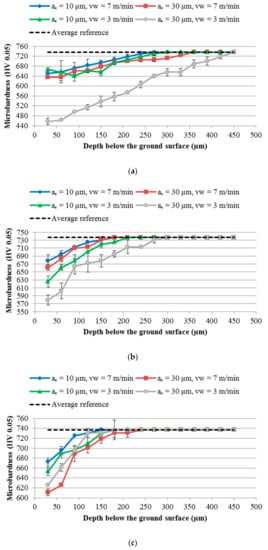 e increases, the undeformed chip thickness per grit and the heat rate also increase, resulting in microstructural changes in the ground workpiece, reducing the material’s hardness. The tests performed using the lowest workspeed (3 m/min) resulted in the most significant microhardness drops. For all cooling–lubrication conditions employed, the most significant drops were found in the tests using the most severe cutting conditions (a