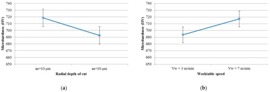Figure 10, the increase in radial depth of the cut from 10 µm to 30 µm provided a 3.6% reduction in the microhardness value, where this percentage was obtained by reducing the workspeed by 7 m/min; for 3 m/min, it was 3.29%. Regarding the cooling–lubrication conditions, the MQL and conventional conditions showed decreases in microhardness, respectively, equal to 0.7% and 5.98% in relation to the MQL + Graphene condition.