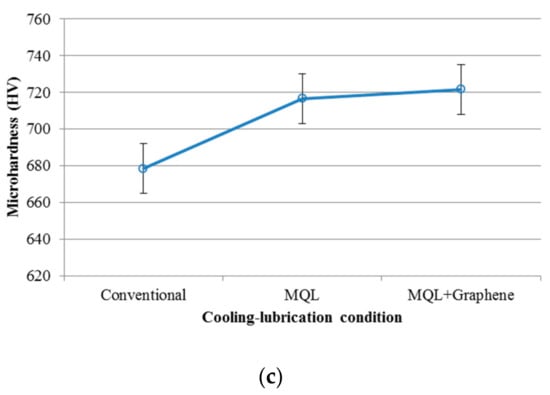 Figure 9, it can be stated that the thermal damages, represented by the microhardness variation, extended below the ground surface (the extent to which it was possible to observe the microhardness variation until reaching the average microhardness of the material) up to approximately 150 μm for the MQL + Graphene condition, 250 μm for the MQL condition, and 400 μm for the conventional condition. This result shows that graphene platelets to the cutting fluid positively influenced the process by minimizing thermal damage to the ground component under the investigated conditions. In other words, this behavior demonstrates the benefit of adding solid particles to the cutting fluid in terms of the sub-surface integrity of the ground components. The dispersion of the graphene platelets mainly contributes to the increase of the lubricating capacity of the fluid, thus reducing the generation of heat in the cutting zone and, consequently, the reduction of the area affected thermally by the portion of the heat that is directed to the workpiece. Consequently, some mechanical properties, such as hardness, are also less affected. As can be seen, compared to the MQL + Graphene condition, the MQL and conventional conditions showed an extension of thermal damage, respectively, 166.7% and 266.7% higher.