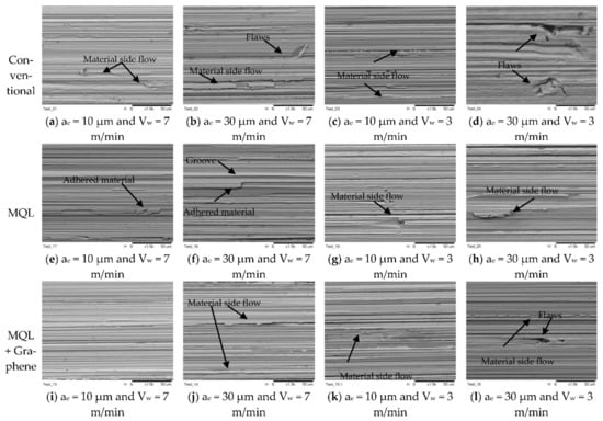 Figure 11. The ground surfaces presented a similar pattern, with grooves mainly oriented in the cutting direction and regions containing flaws and material side flow, followed by adhered material. Usually, grooves oriented in the cutting direction are preferable, as this indicates that the grits have been active and removed the material from the workpiece. Nevertheless, the flaws, material side flow, and adhered material represent surface defects. These events usually occur due to the deficiency of the cooling–lubrication conditions in cooling and/or lubricating the system. In other words, the surfaces that present the most significant amount of these defects result from tests performed with unfavorable tribological conditions [