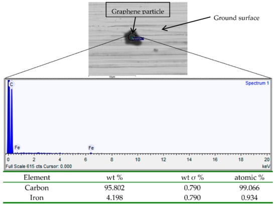 In the analysis by scanning electron microscopy (SEM) and an energy dispersive system (EDS) aid, graphene platelets were found on all ground surfaces using the MQL + Graphene cooling–lubrication conditions, regardless of the cutting conditions employed, as observed in