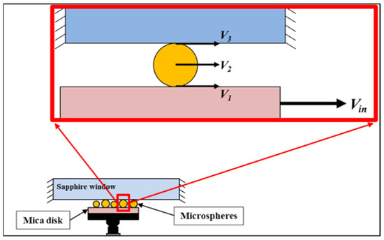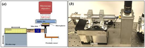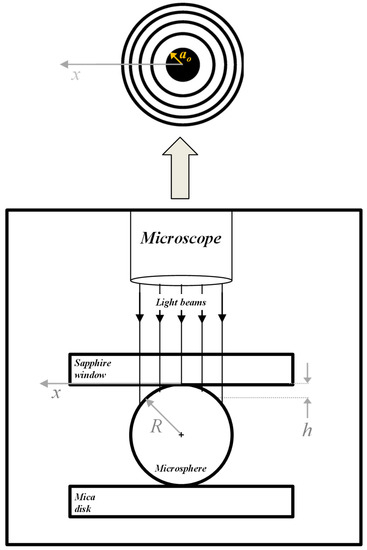 In this study, the tested sapphire specimen was cleaned using acetone and wiped before each test. A freshly cleaved mica disk that had a diameter of 12 mm and a thickness of 0.21 mm was used as the lower flat surface. As shown in Figure 1a, the mica disk was positioned on the free end of the cantilever beam setup. Stainless-steel microspheres were distributed randomly on the top of the mica disk. A sapphire window 27 mm in diameter and 1 mm in thickness was utilized as the upper flat surface. The sapphire window had a modulus of elasticity of 400 GPa and Poisson’s ratio of 0.29. In addition, the transparency of the sapphire window permitted the visualization of the microspheres beneath it.