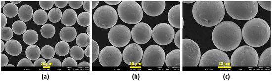 Scanning electron microscopy (SEM) micrographs of stainless-steel particles at different magnifications: (a) ×500; (b) ×750; and (c) ×1000.