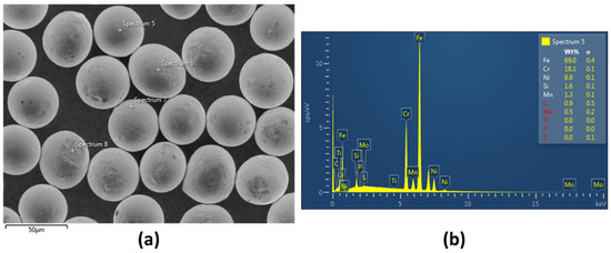(a) SEM micrograph and (b) energy dispersive X-ray spectrum of stainless-steel particles.