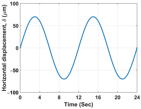 In this study, the precision elevation stage was used to elevate the flat mica disk, with the microspheres on top of it, to bring it into contact with the stationary sapphire surface. The slow vertical movement (equal to 0.1 μm/s) was executed via the elevation stage until surface contact initiation occurs. A proximity sensor located below the mica disk was employed to measure its vertical displacement and the applied normal load as it moves toward the upper sapphire window. Consequently, when surface contact is initiated, the proximity sensor will read no movement of the mica disk, and then the vertical input displacement by the elevation stage was stopped. Next, visual inspection using the optical microscope with the digital camera was used to locate a microsphere in contact with the upper sapphire window. Afterward, a micro-sliding test was performed by moving the mica disk horizontally and concurrently observing the motion of the microsphere. In micro-sliding experiments, the piezoelectric actuator was operated to reciprocate the flat mica disk with the microspheres against the fixed sapphire window at a slow speed. Micro-sliding experiments were performed at a low operational frequency (0.08 Hz) in order to carefully examine the motion of micro steel particles between two flat bodies. During the micro-sliding tests, the input displacement function given to the piezoelectric actuator to move the mica disk was a sinusoidal cycle with an amplitude of 70 μm (see Figure 6). At the same time, the optical microscope, in conjunction with the digital camera, was used to video record the motion of the microsphere. Subsequently, the horizontal output movement of the microsphere in the micro-sliding experiment was obtained by processing the recorded video. In this investigation, the data collection and the control of the piezoelectric motor elevation stage were accomplished via LabView software and using a 20 kHz sampling rate. In this investigation, all experiments were performed at room temperature, and all tests were conducted several times to confirm the repeatability and reliability of the obtained results. The measured sliding velocities and friction force values were obtained with a maximum error of approximately 7%.