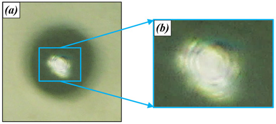 Initially, the mica disk that carries steel microspheres was moved upward via the elevation stage. As soon as the stainless-steel microspheres touched the upper stationary disk, a contact zone was produced in the midpoint of each microsphere. The area of contact between the microspheres and the upper disk can be observed in situ via the microscope-camera system. For a non-conformal contact, Newton’s rings interference pattern was produced around the contact area of each microsphere, and this pattern can be used to detect the center of the area of contact (see Figure 5). Furthermore, the dark area in the middle of the contact, as shown in Figure 5, which represents the contact area, is the zeroth-order destructive interference fringe [39].