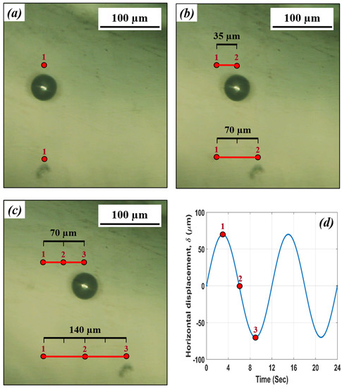Moreover, the micro-sliding investigation was conducted at a very slow operational frequency (0.08 Hz) to closely explore the motion of steel microspheres between the two flat surfaces. The digital camera was used to video record the motion of the microsphere during the micro-sliding test. Later, the in situ acquired video (refer to Supplementary File S1) was processed to extract digital micrographs of the surfaces’ interface throughout the micro-sliding cycle (see Figure 8). The total traveling distance of the microsphere was measured by tracing the center of the microsphere, while the total travel distance of the mica disk was measured by tracing a mark on the mica disk. Figure 8d illustrates the position of the steel microsphere in the extracted digital images (Figure 8a–c) relative to the input displacement cycle given to the piezoelectric motor. It can be seen from Figure 8 that the total traveling distance of the microsphere was 70 μm while the total traveling distance of the mica disk was 140 μm. Thus, the total lateral movement of the mica disk (140 μm) was twice the displacement of the steel microsphere (70 μm).