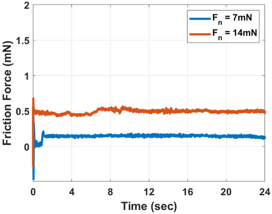 During the micro-sliding experiments, an in-line load sensor was employed to measure the friction force experienced by the microspheres (see Figure 1). Figure 10 depicts the friction force measurements versus time at different applied normal loads (7 and 14 mN). It should be noted that a relatively small sliding distance was used in the friction experiments to visually examine the motion of the solid particles and measure the friction force. Longer sliding distance experiments will result in losing the focus of the optical microscope on the solid particles. It is clear from Figure 10 that very low friction force was measured, and the obtained coefficient of friction was about 0.03. It is well known that rolling friction is considerably lower than sliding friction, and the rolling coefficient of friction is less than 0.1 [40,41]. Therefore, the low coefficient of friction obtained from the micro-sliding experiments confirms the rolling motion of the microspheres between the mating surfaces.