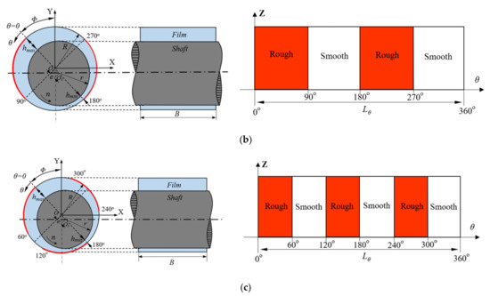 Three types of heterogeneous rough/smooth bearing with different artificial roughness zones, (a) one-rough zone (1 L); (b) two-rough zones (2 L); (c) three-rough zones (3 L).