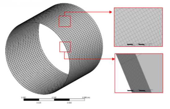 In this study, the mesh used consists of a uniform hexahedral grid. The face-meshing, edge-sizing and sweep-method features are used to form a mesh configuration. This results in the corresponding grid distribution being employed in the radial, circumferential and axial direction: 12 × 400 × 60. For all journal bearing configurations studied here, the mesh distribution is based on independent mesh results. As a note, the division of fluid layers taken after sensitivity analysis revealed that several values (12, 14, 16) of layers division change the chosen main parameter (load-carrying capacity in this case) by less than 2% in the CFD model. To conclude, the 12-layer division of fluid domain is employed for all simulations because it provides a reasonable computational time with a feasible level of independent mesh. In detail, the mesh configuration and the criteria of the mesh formed are shown in Figure 3 and Table 2 below. From Table 2, it can be observed that for all cases here, during the grid generation the average skewness is much lower than 0.25. This indicates that based on the skewness mesh metrics spectrum [29], the following mesh distributions are categorized as excellent and thus the discretization error due to the mesh generation can be prevented.