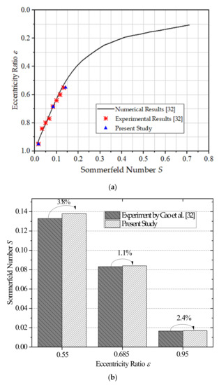 To confirm that the developed CFD model and its solution setup are valid with appropriate accuracy, in this section, a comparison study between the present study and the reference is conducted in terms of the Sommerfeld number S in which . Here, the result is compared with the numerical and experimental data of Gao et al. [32] under the same input conditions and computed operational parameters (i.e., ε = 0.55, ε = 0.685, and ε = 0.95, D = 80 mm, B = 80 mm, c = 0.08 mm, = 63.95°, n = 500–4000 rpm, μ = 0.001 Pa.s, ρ = 998.2 kg/m3), as reflected in Figure 5. It can be found that the obtained values from the CFD code developed here are very close to the published ones both from the numerical and experimental results. Their deviations are less than 4% as indicated in Figure 5b, suggesting validation of the developed CFD code.