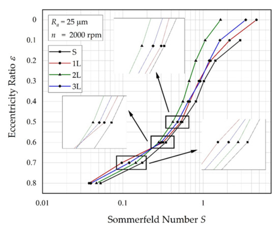 To show the effect of an engineered rough pattern on bearing characteristics, a plot of eccentricity ratio versus Sommerfeld number for both a conventional bearing (Ra = 0 and denoted as S pattern) and the bearing with the heterogeneous rough/smooth area (i.e., 1 L, 2 L, 3 L patterns) is reflected in Figure 6. From Figure 6, several characteristics can be seen. First, for all cases, an increase in the eccentricity ratio will decrease the Sommerfeld number S. The decrease in the Sommerfeld number occurs significantly when the eccentricity ratio ε is greater than 0.2. Secondly, when ε = 0 to 0.6, the heterogeneous rough/smooth bearing pattern with two-rough zones (2 L) gives the lowest Sommerfeld Number value when compared with the conventional smooth bearing (S) pattern and other heterogeneous rough/smooth bearing patterns. However, for eccentricity ratios of 0.7 and 0.8, heterogeneous rough/smooth bearing with one-rough zone (1 L) gives the lowest Sommerfeld Number. In the other words, although not superior to all eccentricity ratios studied here, the 2 L pattern gives the best performance in reducing the Sommerfeld number, which means that the enhanced load-carrying capacity can be achieved. From the results depicted in Figure 6, it can also be observed that the heterogeneous rough/smooth bearing, irrespective of the rough patterns, can generate the load-carrying capacity for all values of eccentricity ratio including for the concentric position. As is known, for the conventional bearing, no load-carrying capacity is produced when the concentric condition is applied due to the absence of the hydrodynamic pressure. This finding is interesting, and hence, the heterogeneous rough/smooth bearing can be compared to the heterogeneous slip/no-slip pattern. Based on the reference [19,22], even though there is no wedge effect in the case of concentric journal bearing, the heterogeneous slip/no-slip pattern could produce a relatively high load-carrying capacity. It indicates that the behavior of a “rough” surface can be correlated to the wettability of the surface (in particular the surface with hydrophobic coating) inducing the slip boundary. This is understandable because as discussed by Patankar [34] and Jung and Bhushan [35], the wettability of a surface is a function of its roughness.