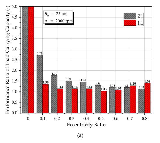Figure 7 shows the performance ratio of the load-carrying capacity for 1 L and 2 L patterns varying by eccentricity ratios. As a note, in Figure 7 the 3 L pattern is excluded because as depicted in Figure 6, the 3 L has a severe behavior in terms of Sommerfeld number compared to the other patterns. From Figure 7, the following features can be drawn. First, the values of the performance ratio for the heterogeneous rough/smooth bearings (1 L and 2 L) have a value above one which indicates that the load-carrying capacity of the two models is better when compared to the conventional (smooth) model for all eccentricity ratios considered here. It can also be drawn from Figure 7 that the benefit of heterogeneous rough/smooth patterns decreases with increased eccentricity ratio. Once again, this behavior seems to be similar to the behavior of the journal bearing with a heterogeneous slip/no-slip pattern. As discussed by several researchers focusing on the application of the heterogeneous slip/no-slip bearing, for example, Fortier and Salant [19], and Cui et al. [23], the eccentricity ratio reduces the positive effect of the applied engineered slip surface. In other words, the larger effect of the heterogeneous rough/smooth pattern can be achieved if the wedge effect is reduced. Second, the ratio of the load-carrying capacity of the 2 L model to the smooth model is higher at an eccentricity ratio from 0.1 to 0.6. For the eccentricity ratios of 0.7 and 0.8, the 1 L model has a higher performance ratio. This result is consistent with the previous finding as shown in Figure 6 in terms of Sommerfeld Number. This is understandable because the value of the load-carrying capacity of a journal bearing is inversely proportional to the value of the Sommerfeld Number. Third, it should be noted that as reflected in Figure 7, for the case of concentric position (ε = 0), the conventional (smooth) bearing cannot support the load, and as a consequence the value of the performance ratio of the load-carrying capacity for two models becomes infinite. From Figure 7, it is confirmed that the heterogeneous rough/smooth pattern in the concentric position of the journal bearing can support a load of 6.2 N for 1 L, and 17.53 N for 2 L. Once again, this indicates that the application of rough/smooth patterns can be promising in low loading operational condition.
