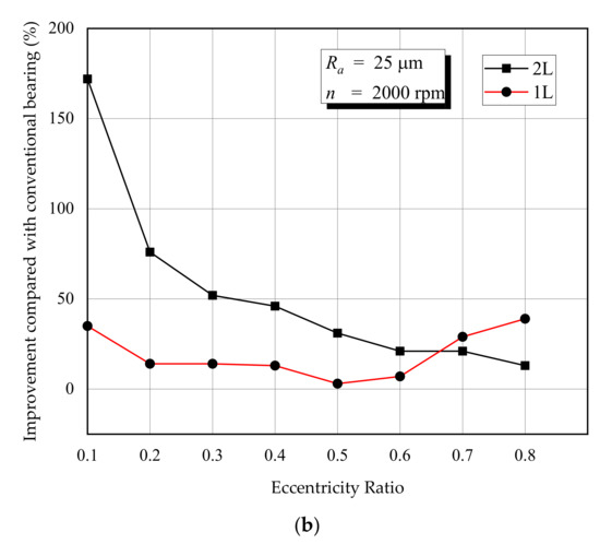 Fourth, the differences in the placement and number of the rough zone for the design of the heterogeneous rough/smooth patterns have an impact on the load-carrying capacity of a journal bearing. For ε = 0.1, the performance ratio of the 2 L model is 101.8% higher than that of the 1 L model. At the medium loading position, say ε = 0.4, the 2 L model has a higher performance ratio of 54.8% when compared to the 1 L model. At the heavy loading position, i.e., ε = 0.8, the 1 L model has an increase in bearing performance which is 23.1% higher than the 2 L model. This result strengthens the findings highlighted in Figure 6, that the 2 L model is superior for the eccentricity ratios from 0 to 0.6.