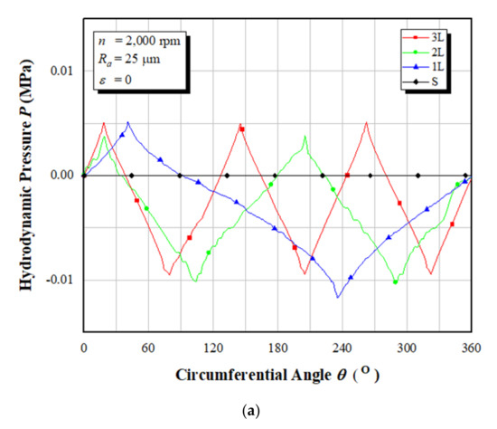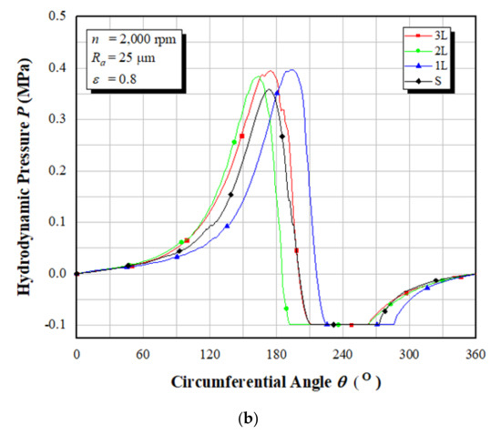 Based on Figure 8, it is observed that for the case of a heterogeneous rough/smooth bearing with the 2 L pattern, the predicted maximum pressure is 11% higher compared with the conventional bearing. It indicates that for the same eccentricity ratio, the bearing with an engineered rough pattern can sustain a higher load than a conventional bearing. Again, this result strengthens the hypothesis proposed that the concept of heterogeneous rough/smooth bearings is very similar to the heterogeneous slip/no-slip pattern concerning how the heterogeneous rough/smooth bearing produces the load-carrying capacity. Fortier and Salant [19] found that the bearing with slip yields a lower Sommerfeld number (or higher load-carrying capacity) than the corresponding conventional bearing with the same eccentricity ratio. It is also confirmed from Figure 8 that, unlike the case with high ε, the pressure profiles are strongly affected by the placement and the number of the rough zones for the case with low ε. For example, for the 3 L pattern, three peak pressures can be observed following the number of rough zones. However, when the ε is increased to be very high (ε = 0.8 in this case), the 3 L pattern produces only one peak pressure for high. This means that the effect of the heterogeneous rough/smooth surface decreases with increased wedge effect. Again, this characteristic can be compared to the one with a heterogeneous slip/no-slip surface.