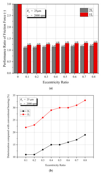 In terms of friction force, the effects of the application of 1 L and 2 L heterogeneous rough/smooth bearings are reflected in Figure 10. Specific features can be observed based on Figure 10. First, unlike the load-carrying capacity, the engineered rough zone leads to greater friction force compared to the conventional bearing. Compared to conventional journal bearings, the friction force of the heterogeneous rough/smooth bearing is 11–32% higher depending on the eccentricity ratio and the rough pattern (i.e., location and number). In other words, the application of the rough zone leads to a negative effect on friction. Second, concerning the eccentricity ratio effect, the performance ratio of frictional force for the 2 L and 1 L models does not change very much as the eccentricity ratio increases. The numerical results indicate that the use of the 2 L pattern consistently generates around 12% lower friction force compared with the 1 L bearing irrespective of the eccentricity ratio.