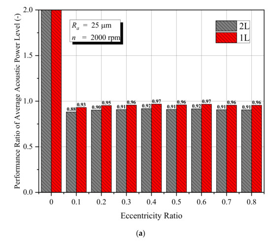 Concerning the acoustic performance, it is interesting to explore the characteristics of the main indicator of the bearing noise, namely, the average acoustic power level. For the researchers, the reduction in the average acoustic power level is considered as standard for enhancing the acoustic performance of contacting pairs. Is the average acoustic power level affected by the engineered rough surface? Is it significant or not? To answer these questions, the histogram of the performance ratio of the average acoustic power level versus the eccentricity ratio is presented in Figure 11a, while in Figure 11b, the enhancement of the acoustic power level by the heterogeneous rough/smooth patterns is shown. It should be noted that for an eccentricity ratio of 0 (i.e., concentric position), the conventional (smooth) bearings do not have a level of acoustic strength inducing the infinite value of the performance ratio for the two models. Based on Figure 11, it can be observed that the heterogeneous rough/smooth bearings bring out the improvement of the acoustic performance in terms of average acoustic power level irrespective of the rough zone placement. Compared with the conventional bearing, a 4–12% lower noise level can be achieved. Further, the numerical results show that the 2 L pattern produces a 5% lower average acoustic power level compared to the 1 L pattern for all eccentricity ratios. This indicates that reasonably engineering a rough zone position is essential in reducing the bearing noise. Additionally, these results also strengthen the previous result concerning the positive effect of the 2 L pattern application in enhancing load-carrying capacity.