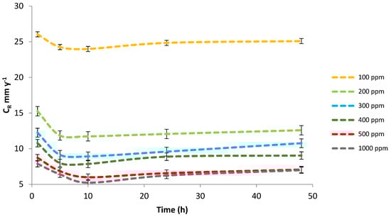 The corrosion rate and protection efficiency values were determined from mass loss techniques at various concentrations of BOT in 1.0 M HCl after immersion periods (1, 5, 10, 24 and 48 h), at 303 K. The experimental results are demonstrated in Figure 2 and Figure 3. It was noted that BOT controls and/or retarding the mild steel corrosion in 1.0 M corrosive environments at different concentrations were applied in the investigation. Certainly, the mild steel rate of corrosion values decreased from 24.25 to 6.86 mmy−1 on the increase in the inhibitor concentration from 100 to 500 ppm as appears in Figure 2. It is obvious from Figure 3 that the protection performance increased from 48.9 to 96.274.8% in presence of 100 to 500 ppm of BOT at 5 h as immersion time. The highest inhibitive efficacy was determined at 1000 ppm concentration of BOT and additional increasing concentration of BOT did not increase inhibition efficiency. The inhibition efficiency at the inhibitor concentration 500 ppm was 96.2%; this value had no significant change compared with the inhibition efficiency at the inhibitor concentration 1000 ppm, which was 96.7% at 5 h as immersion time. The effect of higher adsorption and greater covering of BOT molecules on the mild steel surface with increasing BOT concentration could explain the improved inhibition efficiency and reduced corrosion rate [,].