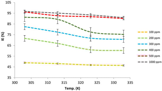 Temperature can vary the interaction between the mild steel surface and the corrosive environment in the absence and presence of a tested inhibitor (BOT). The corrosion rate and protection efficiency values obtained from weight loss measurements for mild steel in 1 M HCl in the presence of various concentrations of BOT at the temperature range 303–333 K are postulated in Figure 4. The weight loss findings show that the corrosion rate increased with raising the temperature in the presence of various inhibitor concentrations for 5 h as immersion time. In the presence of BOT molecules, the surface coverage (θ), determined by IE/100, reduced lightly with rising temperature, which might be owing to the desorption of the BOT molecules from the mild steel surface. The insignificant reduction of surface coverage implies that the protection performance of BOT is temperature independent. Hence, BOT works as an effective inhibitor in the range of temperature investigated [,,,].