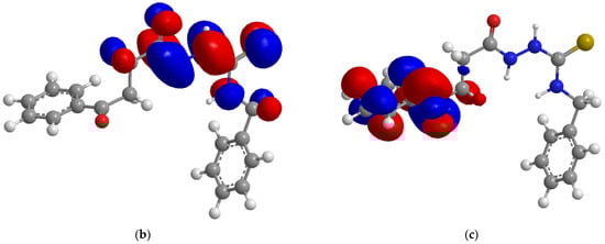 Quantum chemical investigations have been performed to compare the corrosion inhibition efficacy of the tested inhibitor molecules with the computed frontier molecular orbital (FMO) energy levels. Moreover, the quantum chemical computations results could be achieved without lab analyses, therefore avoiding wasting time and material []. Quantum chemical parameters determined from the computations which are efficient for the protection performance of tested inhibitor molecules, such as the FMOs energies (EHOMO and ELUMO), the energy of separation (ELUMO − EHOMO), ΔE, describing the reactivity function, the net charge on the functional group, dipole moment and total energy, are collected in Table 1. The EHOMO describes a molecule’s ability to donate a lone pair of electrons; the higher the EHOMO value, the greater the molecule’s tendency to donate electrons to an electrophilic reagent, while the lower the ELUMO, the greater the molecule’s tendency to accept electrons from iron atoms. The energy variation between EHOMO and ELUMO informs on the reactivity of the given chemical; the smaller the ΔE value, the greater the reactivity of the molecule, as seen in Table 1. When compared to several previously published molecules, the results demonstrate that BOT has the lowest value (2.608 eV) and is thus the most reactive molecule []. The polarity is determined by the dipole moment. The polarity of a molecule is proportional to its dipole moment []. The orbital electron energies were spread uniformly across the molecules, according to the BOT’s HOMO and LUMO diagrams (Figure 6a–c).
