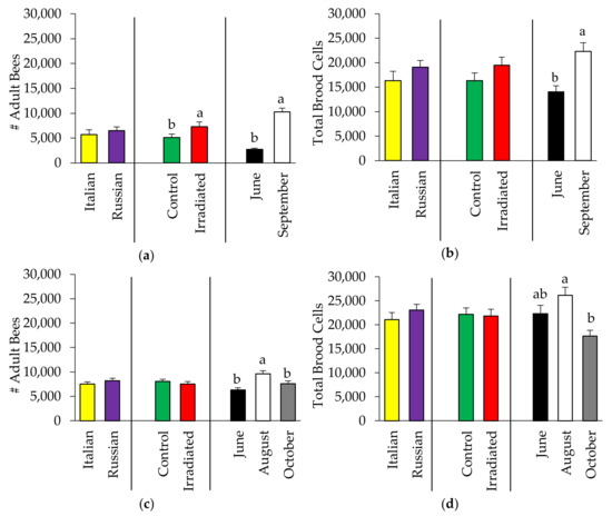Bee and brood production (mean ± SE) in Italian and Russian honey bee colonies having irradiated or non-irradiated (control) combs: (a) 2015 adult bees; (b) 2015 brood cells; (c) 2016 adult bees; and (d) 2016 brood cells. For each group, bars with the same letters are not significantly different (p > 0.05); without letters indicates no differences.