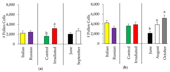 Analysis of the amount of stored pollen showed no significant two-way interactions. Likewise, the amount of stored pollen did not vary between the Italian and Russian honey bee colonies both in 2015 (F = 2.30, p = 0.135; Figure 2a) and 2016 (F = 2.65, p = 0.108; Figure 2b). However, irradiation of combs affected the amount of stored pollen in 2015 (F = 7.39, p = 0.009), but not in 2016 (F = 0.31, p = 0.581). Further, the amount of pollen stored in 2015 colonies was the same for both months of observations (F = 0.01, p = 0.905), while there was an increasing amount of stored pollen through time in 2016 (F = 8.83, p = 0.0004).