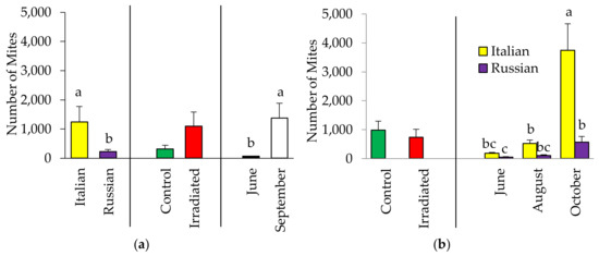 Total (mean ± SE) number of Varroa in Italian and Russian honey bee colonies having irradiated or non-irradiated (control) combs in (a) 2015 and (b) 2016. For each group, bars with the same letters are not significantly different (p > 0.05); without letters indicates no differences.