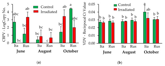 Wax-borne levels (mean ± SE) of (a) Chronic bee paralysis virus (CBPV) and (b) Varroa destructor virus-1 (VDV-1) in Italian and Russian honey bee colonies having irradiated or non-irradiated (control) combs across the season. Bars with the same letters are not significantly different (p > 0.05). Ita = Italian; Rus = Russian
